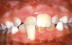 The upper front teeth extend out over the lower front teeth, sometimes causing the lower front teeth to bite into the roof of the mouth.
