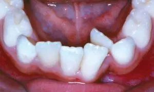 The upper teeth sit inside the lower teeth, which may cause tooth stratification and misaligned jaw growth.